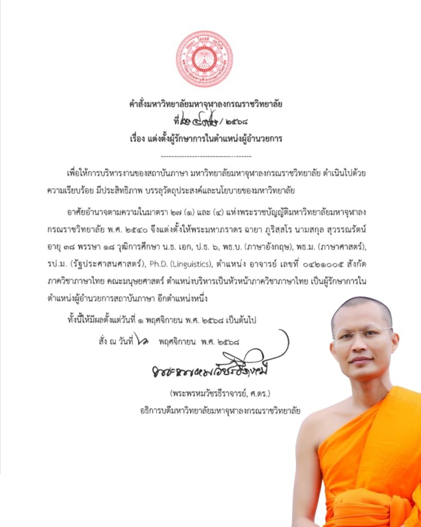 “เป็นผู้รักษาการในตำแหน่งผู้อำนวยการสถาบันภาษา” อีกตำแหน่งหนึ่ง