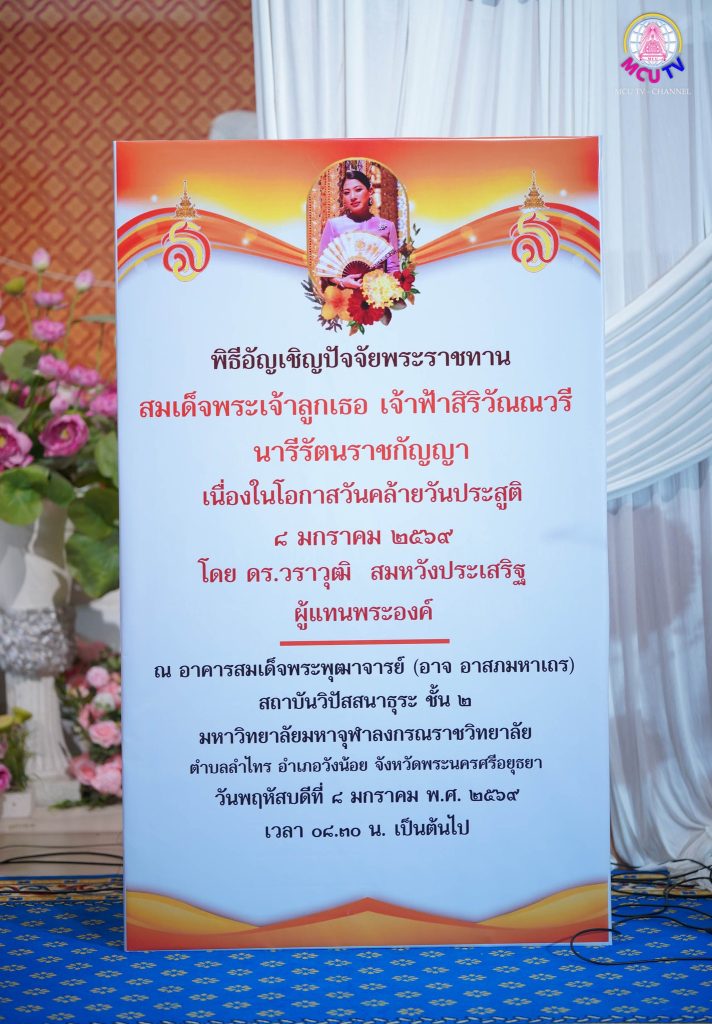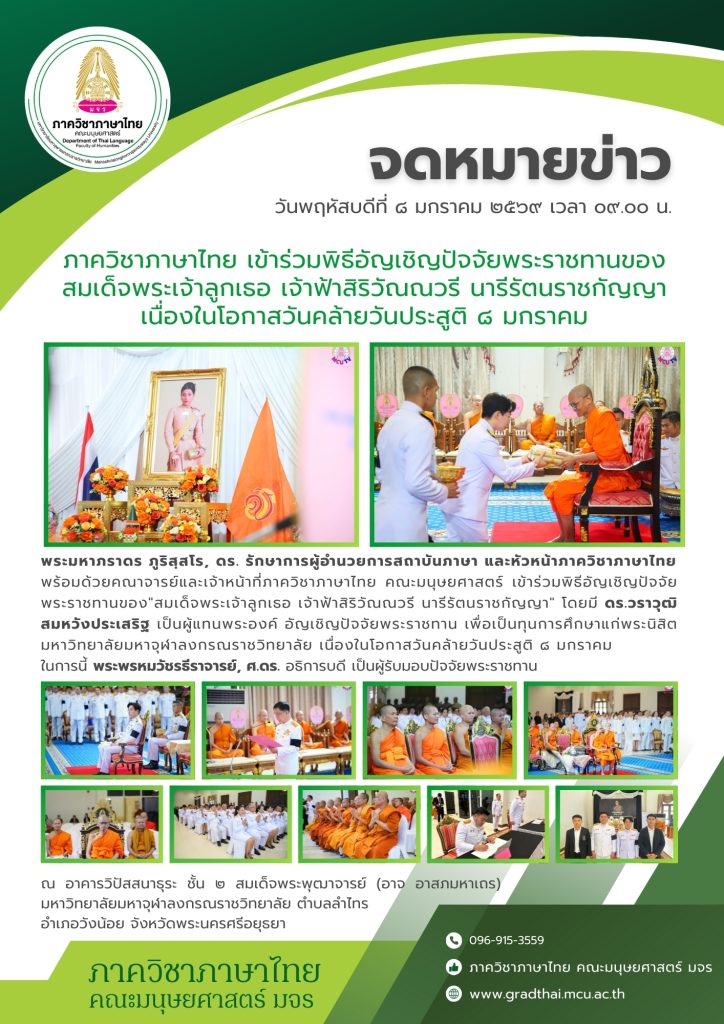 พระมหาภราดร ภูริสฺสโร, ดร. รักษาการผู้อำนวยการสถาบันภาษา และหัวหน้าภาควิชาภาษาไทย พร้อมด้วยคณาจารย์และเจ้าหน้าที่ภาควิชาภาษาไทย คณะมนุษยศาสตร์ เข้าร่วมพิธีอัญเชิญปัจจัยพระราชทานของ”สมเด็จพระเจ้าลูกเธอ เจ้าฟ้าสิริวัณณวรี นารีรัตนราชกัญญา” โดยมี ดร.วราวุฒิ สมหวังประเสริฐ เป็นผู้แทนพระองค์ อัญเชิญปัจจัยพระราชทาน เพื่อเป็นทุนการศึกษาแก่พระนิสิต มหาวิทยาลัยมหาจุฬาลงกรณราชวิทยาลัย เนื่องในโอกาสวันคล้ายวันประสูติ ๘ มกราคม
