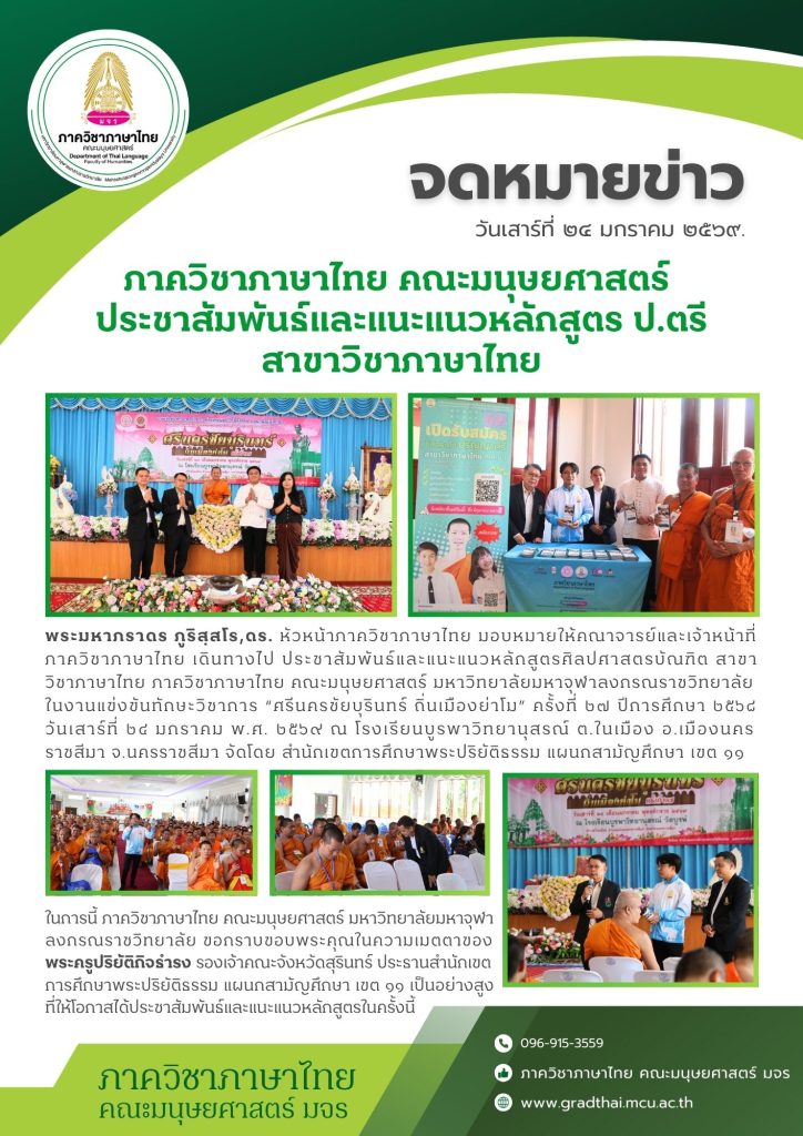 พระมหาภราดร ภูริสฺสโร,ดร. หัวหน้าภาควิชาภาษาไทย มอบหมายให้คณาจารย์และเจ้าหน้าที่ ภาควิชาภาษาไทย เดินทางไป ประชาสัมพันธ์และแนะแนวหลักสูตรศิลปศาสตรบัณฑิต สาขาวิชาภาษาไทย ภาควิชาภาษาไทย คณะมนุษยศาสตร์ มหาวิทยาลัยมหาจุฬาลงกรณราชวิทยาลัย ในงานแข่งขันทักษะวิชาการ “ศรีนครชัยบุรินทร์ ถิ่นเมืองย่าโม” ครั้งที่ ๒๗ ปีการศึกษา ๒๕๖๘ วันเสาร์ที่ ๒๔ มกราคม พ.ศ. ๒๕๖๙