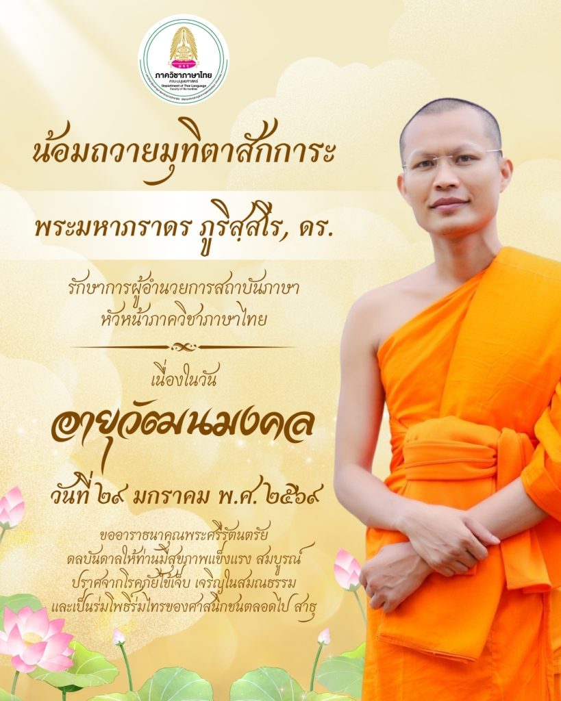 เนื่องในโอกาสวันอายุวัฒนมงคล ๒๙ มกราคม พระมหาภราดร ภูริสฺสโร,ดร. รักษาการผู้อำนวยการสถาบันภาษาและหัวหน้าภาควิชาภาษาไทย นำคณาจารย์และเจ้าหน้าที่ภาควิชาภาษาไทย คณะมนุษยศาสตร์ เป็นเจ้าภาพภัตตาหารเพล ถวายแด่ผู้บริหาร คณาจารย์ เจ้าหน้าที่ และพระนิสิตชาวไทยและนานาชาติ มหาวิทยาลัยมหาจุฬาลงกรณราชวิทยาลัย