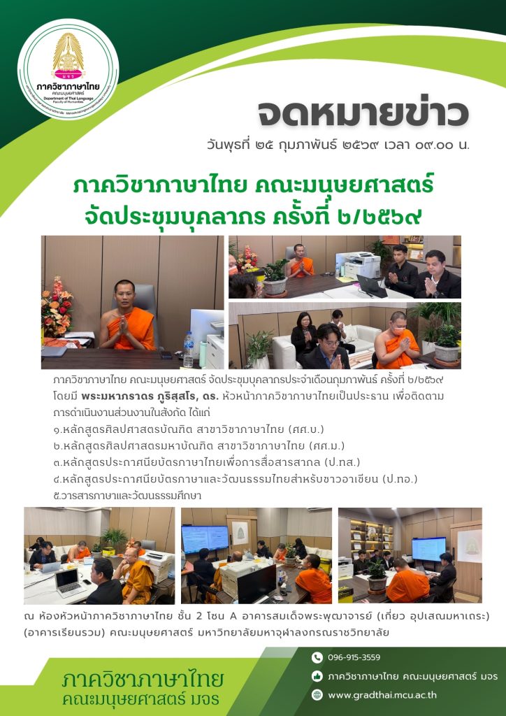 ภาควิชาภาษาไทย คณะมนุษยศาสตร์ จัดประชุมบุคลากรประจำเดือนกุมภาพันธ์ ครั้งที่ ๒/๒๕๖๙ โดยมี พระมหาภราดร ภูริสฺสโร, ดร. หัวหน้าภาควิชาภาษาไทย เป็นประธาน เพื่อติดตามการดำเนินงานส่วนงานในสังกัด ได้แก่