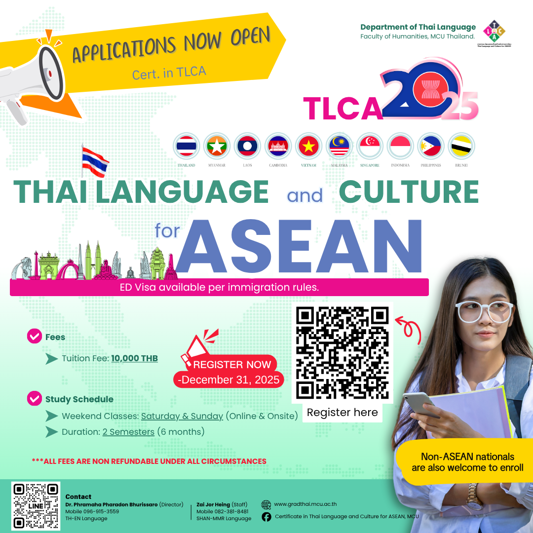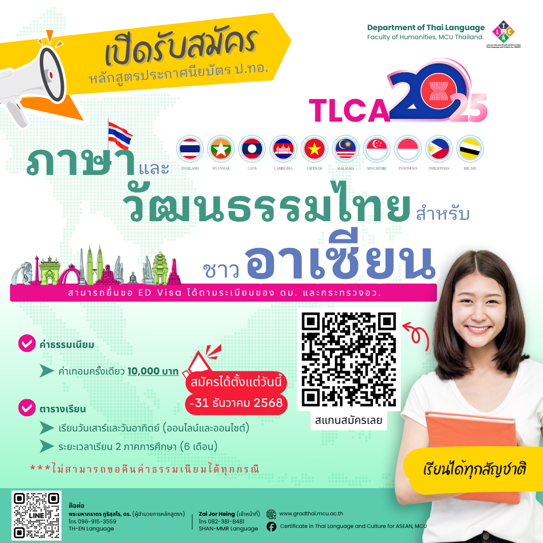 The Thai Language and Culture Certificate Program for ASEAN (TLCA) aims to provide academic services in Thai language and culture to enable learners to acquire knowledge and skills in Thai language and culture for communication and adaptation in multicultural environments appropriately and correctly according to Thai social and cultural contexts